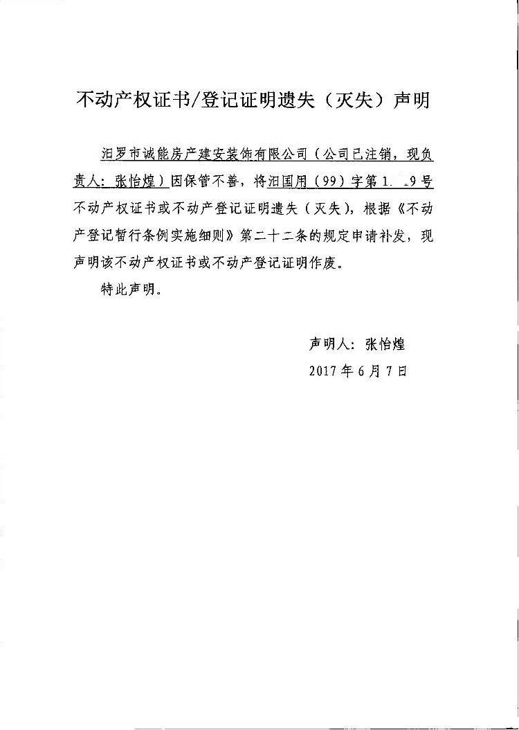 不动产权证书遗失声明(张怡煌)