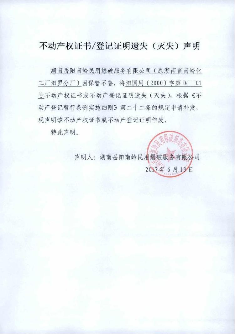 不动产权证书遗失声明(湖南岳阳南岭民用爆破服务有限公司)