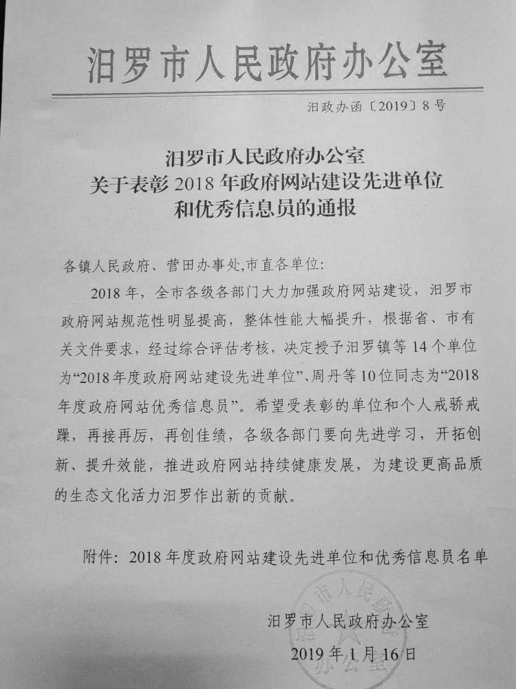 汨罗市人民政府办公室关于表彰2018年政府网站建设先进单位和优秀信息员的通报