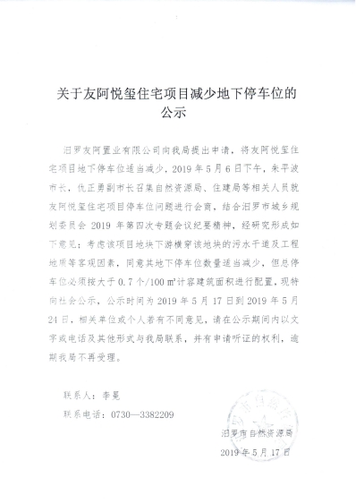 关于友阿悦玺住宅项目减少地下停车位的公示