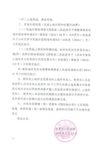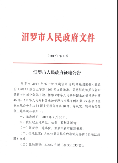 汨罗市人民政府征地公告【2017】第8号