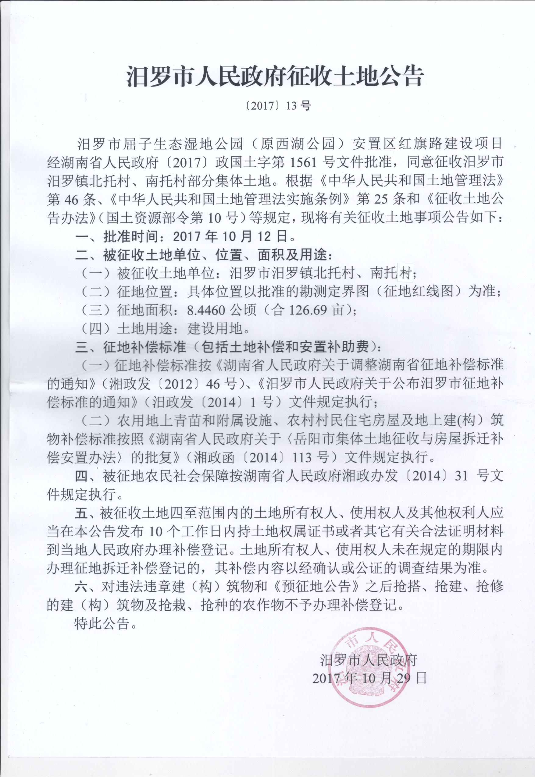汨罗市西湖公园安置区红旗路建设项目征地公告