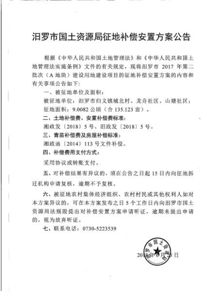 汨罗市2017年第二批次(A地块)建设用地补偿安置方案公告