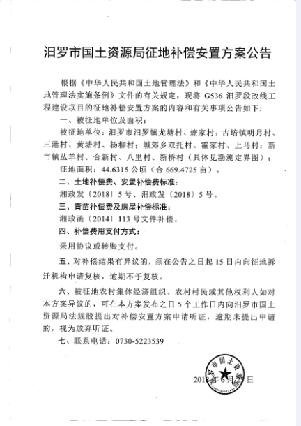 G536汨罗段改线工程建设项目补偿安置方案公告