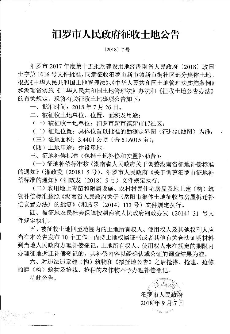 汨罗市2017年第十五批次建设用地征地补偿安置方案和征收土地公告