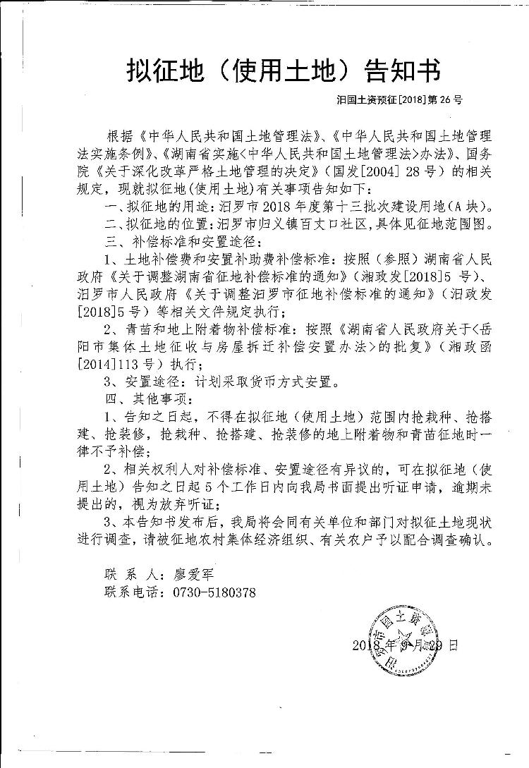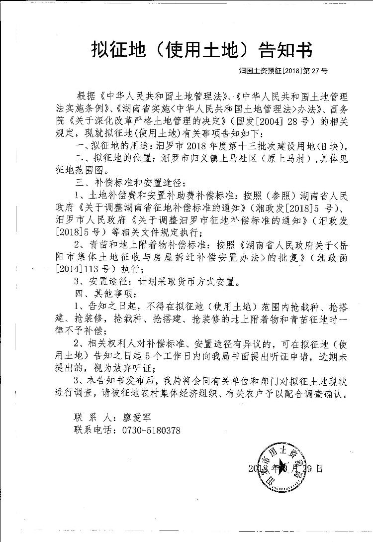 汨罗市2018年度第十三批次建设用地(A、B块)拟征地告知书