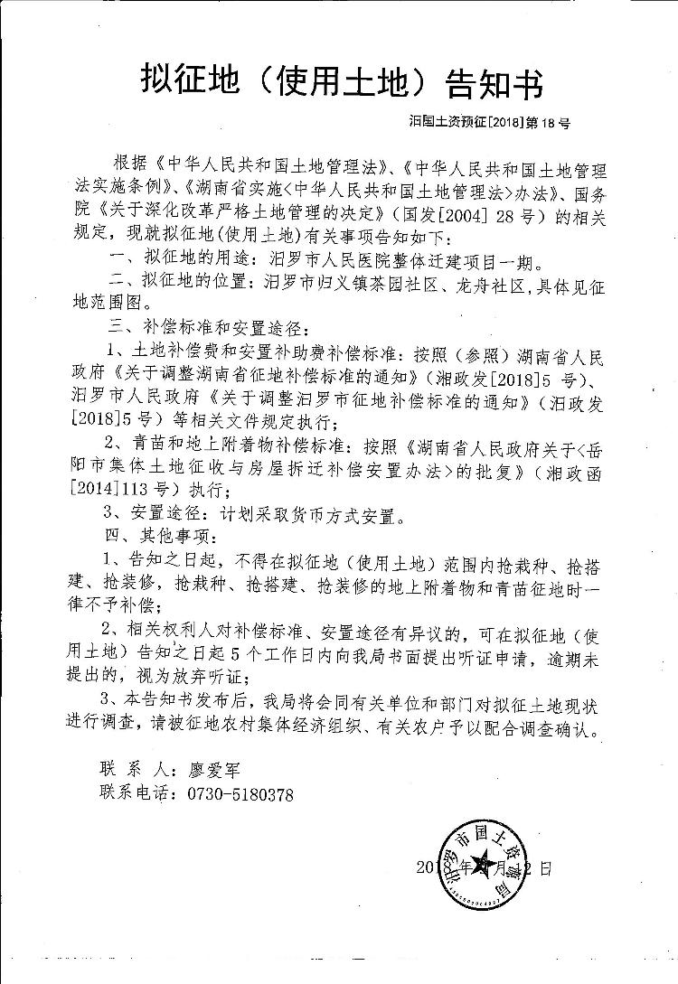 汨罗市人民医院整体迁建项目一期拟征地告知书