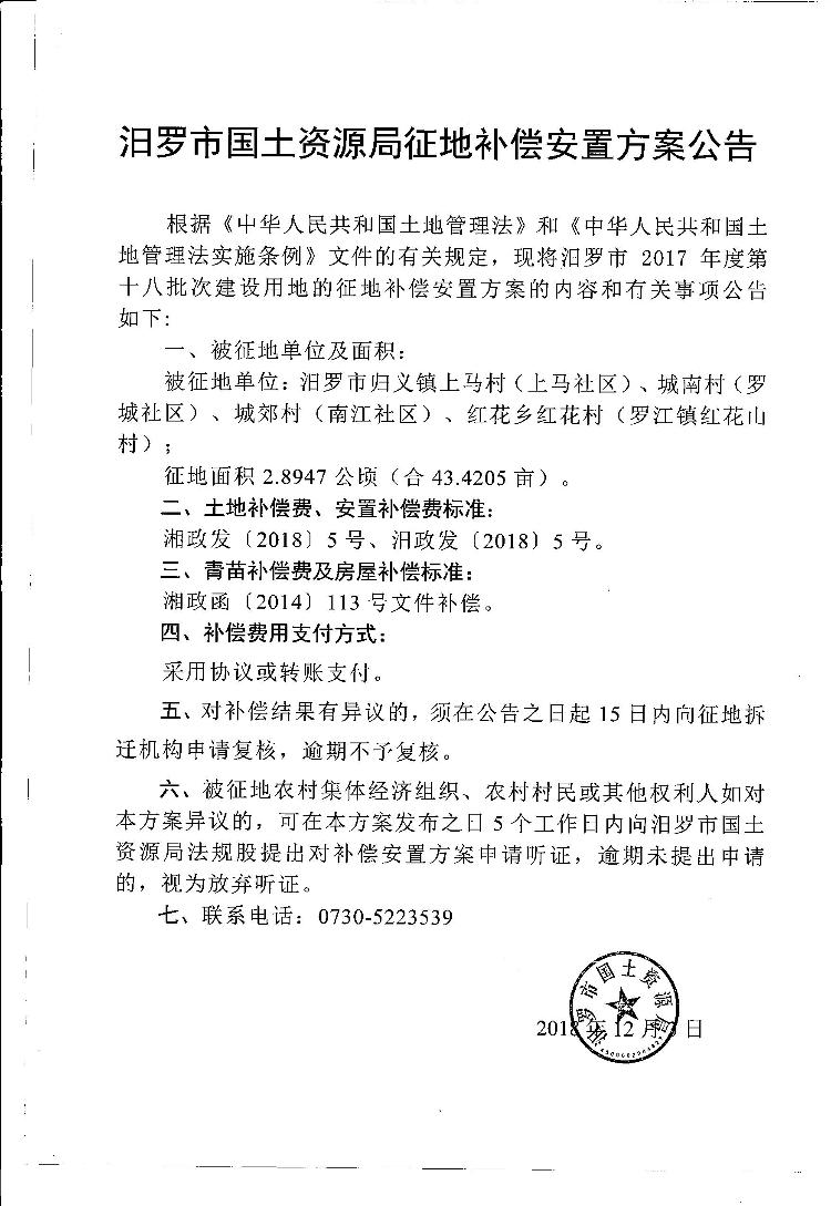 汨罗市2017年度第十八批次建设用地汨罗市国土资源补偿安置方案
