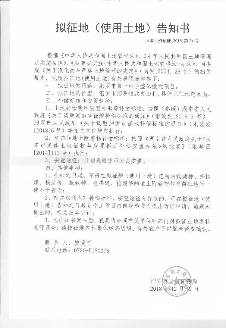 汨罗市第一中学整体搬迁项目拟征地告知书
