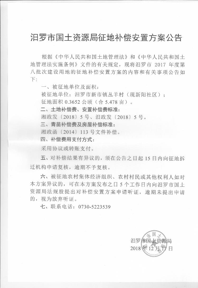 汨罗市2017年度第八批次建设用地征地补偿安置方案公告