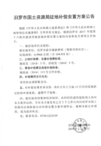 汨罗市2017年度第十六批次建设用地征地补偿安置方案公告