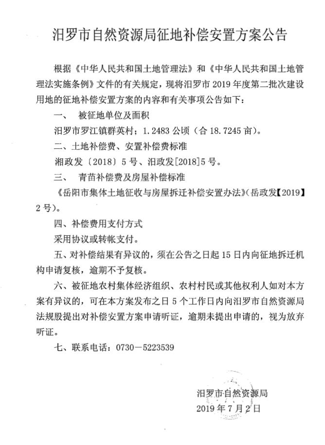 汨罗市2019年度第二批次建设用地 补偿安置方案公告