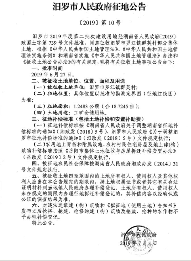 汨罗市2019年度第二批次建设用地 征地公告
