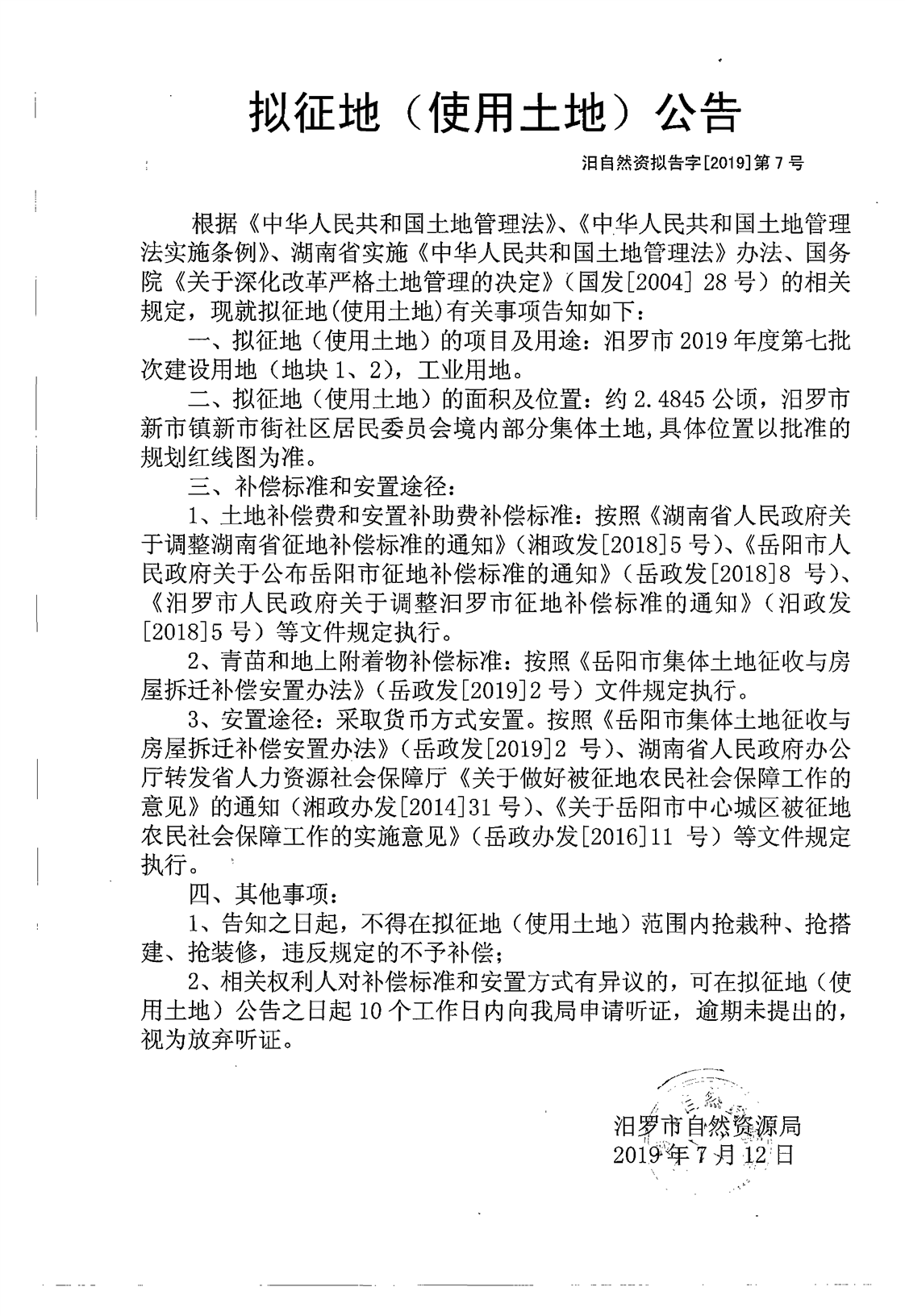 汨罗市2019年度第七批次建设用地(地块1、2)拟征地公告