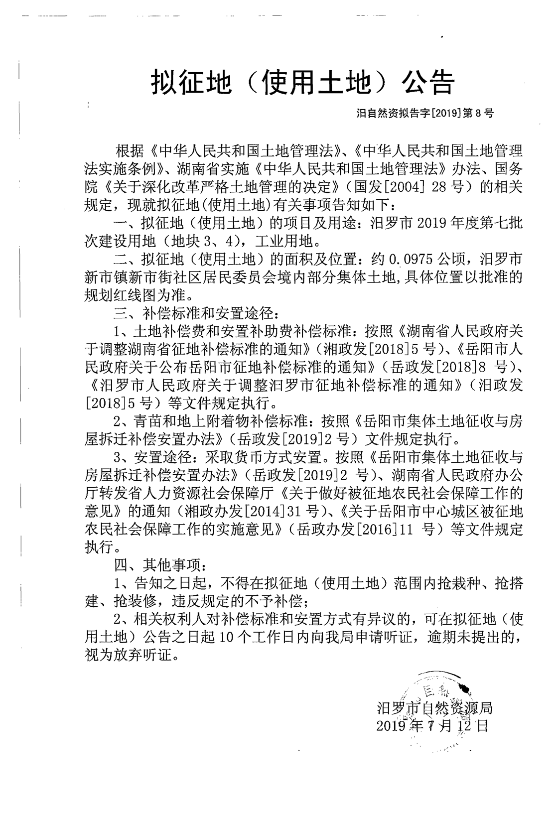 汨罗市2019年度第七批次建设用地(地块3、4)拟征地公告