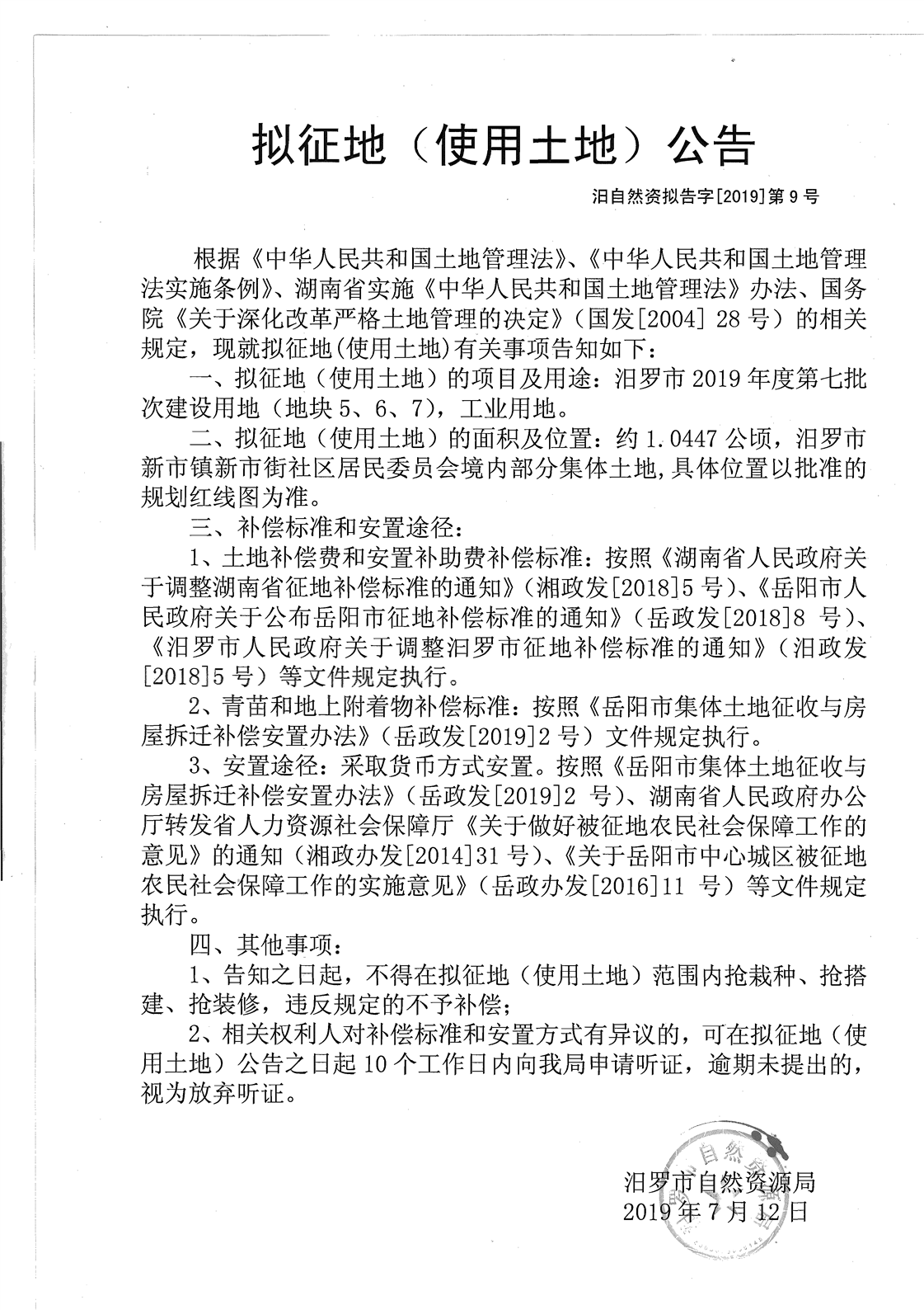 汨罗市2019年度第七批次建设用地(地块5、6、7)拟征地公告