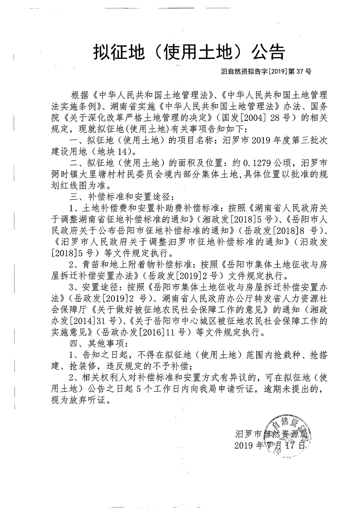 汨罗市2019年度第三批次建设用地(地块14)拟征地公告