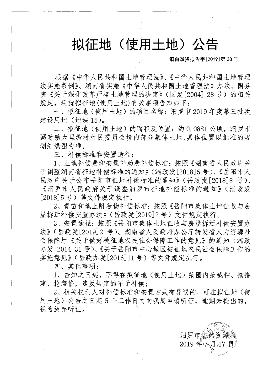 汨罗市2019年度第三批次建设用地(地块15)拟征地公告