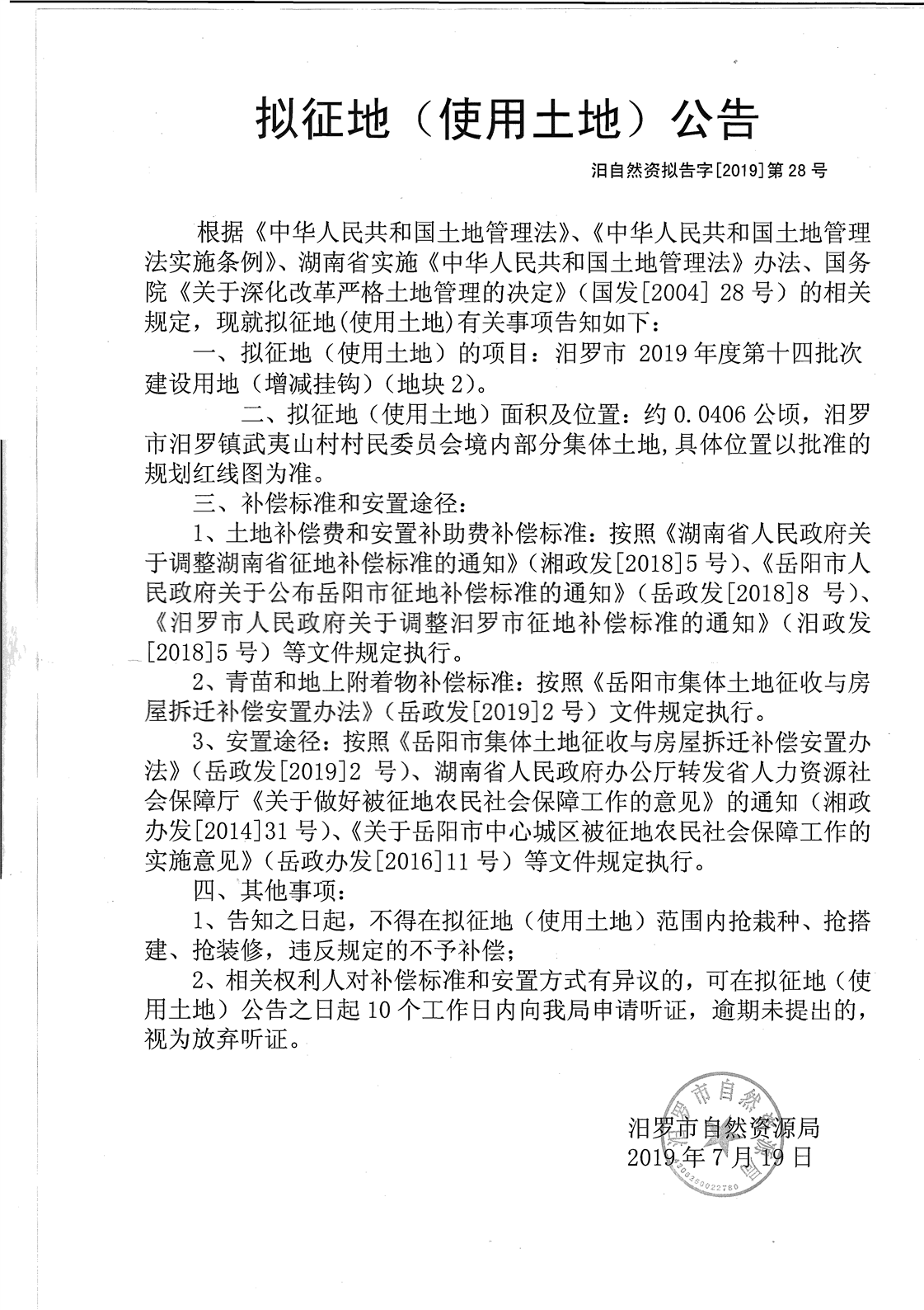汨罗市2019年度第十四批次建设用地(增减挂钩)(地块2)拟征地公告