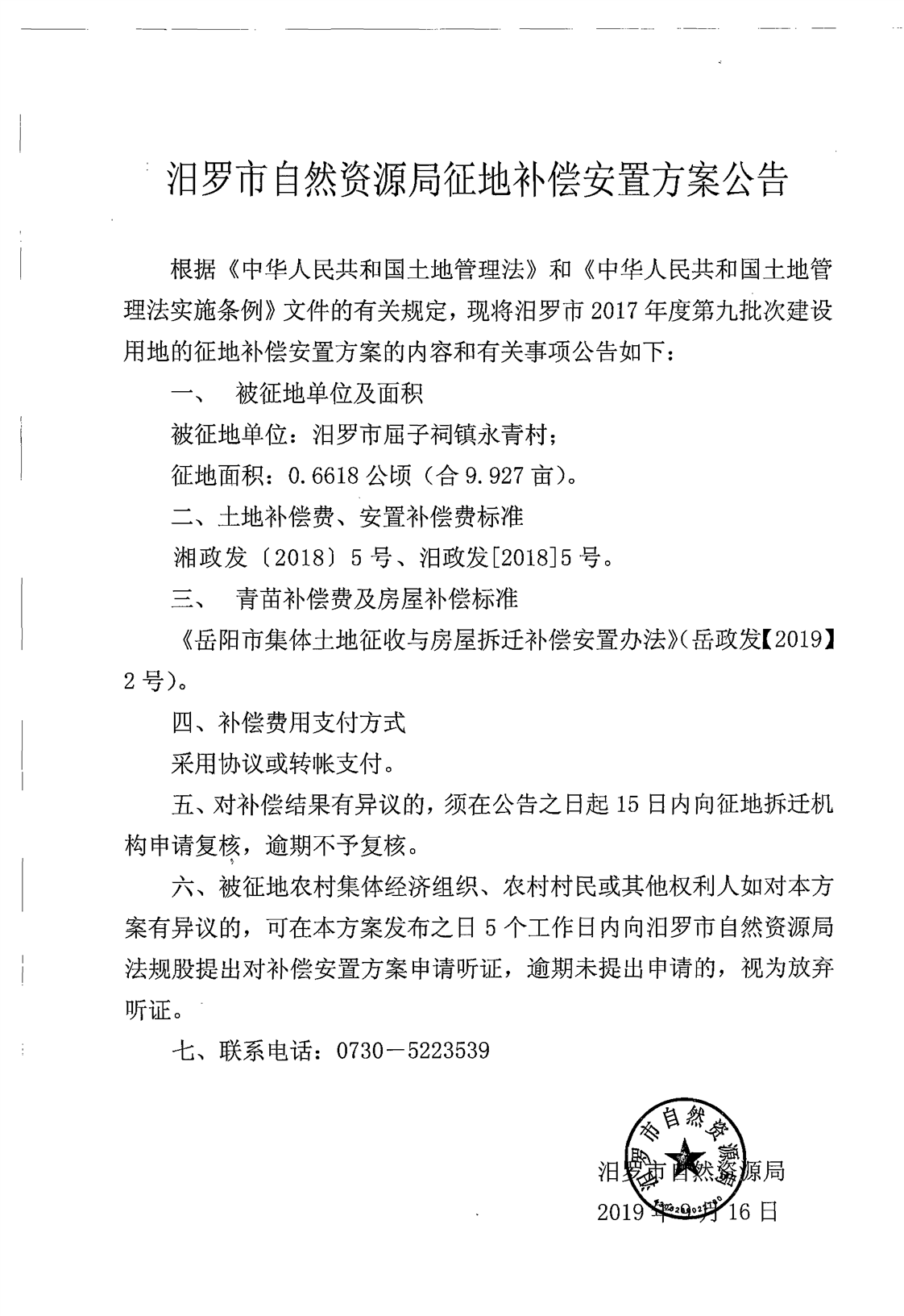 汨罗市2017年度第九批次建设用地 补偿安置公告
