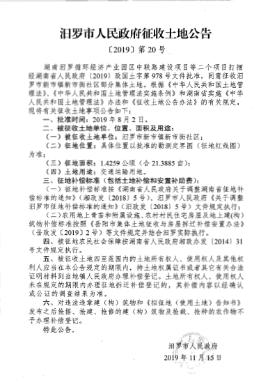 湖南汨罗循环经济产业园区中联路建设项目征收土地公告