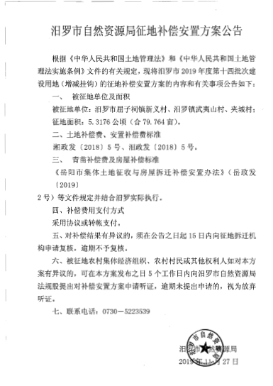 汨罗市2019年度第十四批次建设用地(增减挂钩)征地补偿安置方案