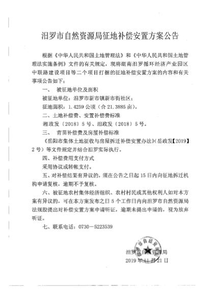 湖南汨罗循环经济产业园区中联路建设项目征地补偿安置方案公告