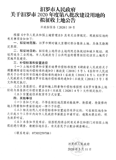 汨罗市2020年度第八批次建设用地拟征收土地公告