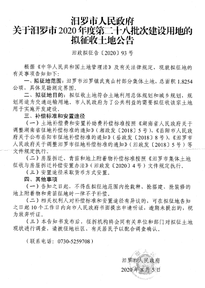 汨罗市2020年度第二十八批次建设用地拟征地公告