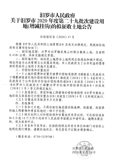 汨罗市2020年度第二十九批次建设用地拟征地公告