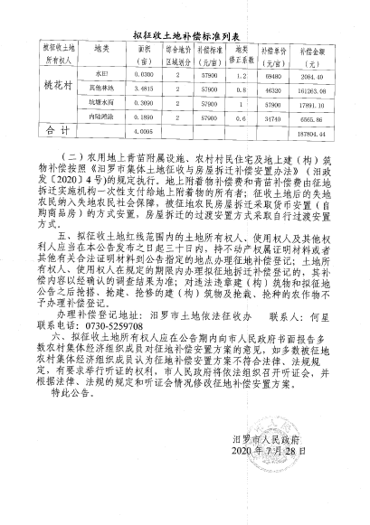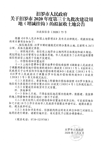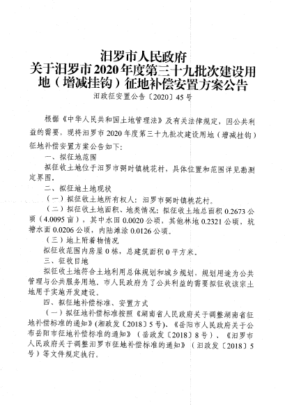 汨罗市2020年度第三十九批次建设用地征地信息公开