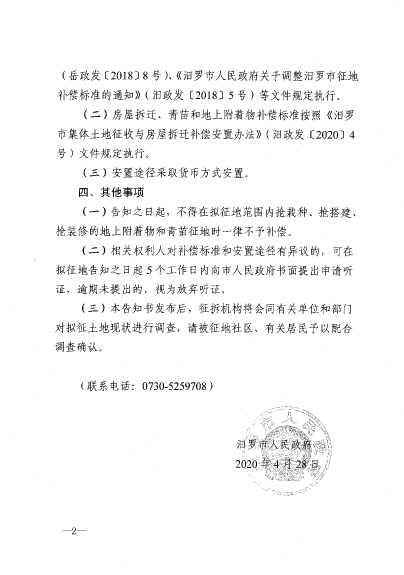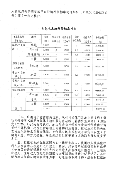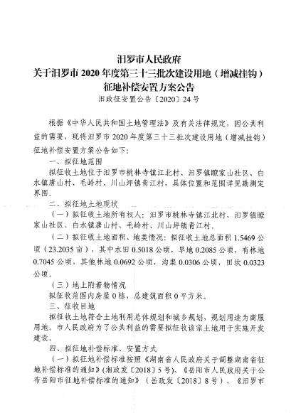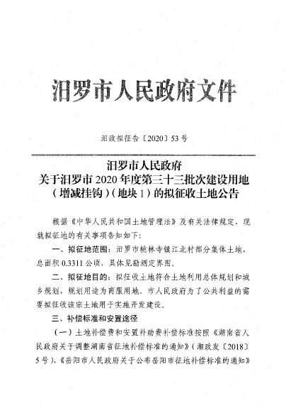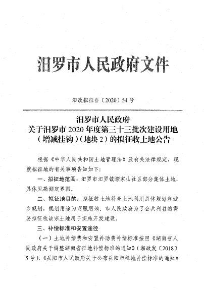 汨罗市2020年度第三十三批次建设用地(增减挂钩)征地信息公开