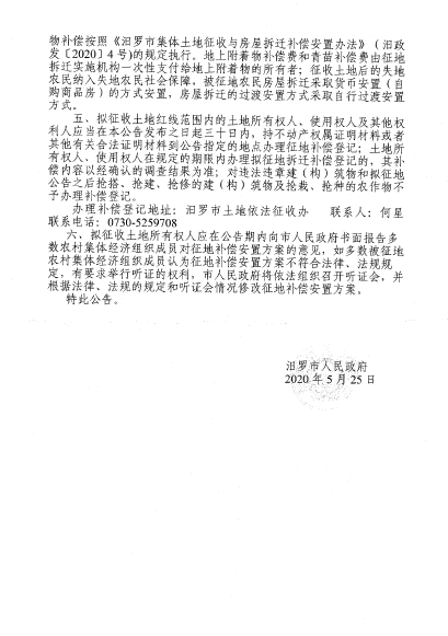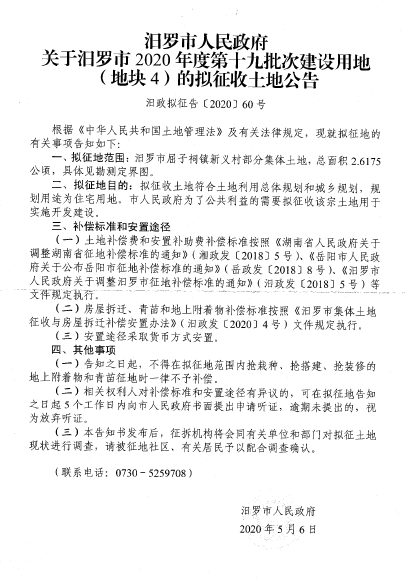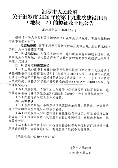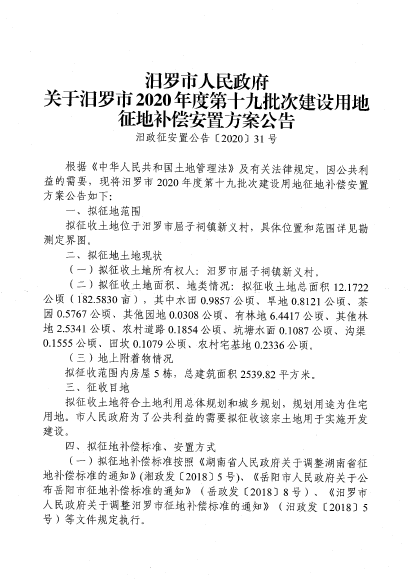汨罗市2020年度第十九批次建设用地征地信息公开