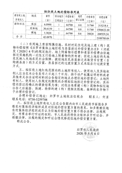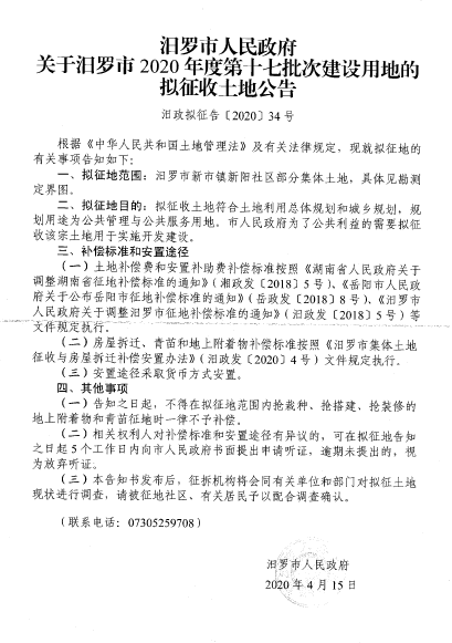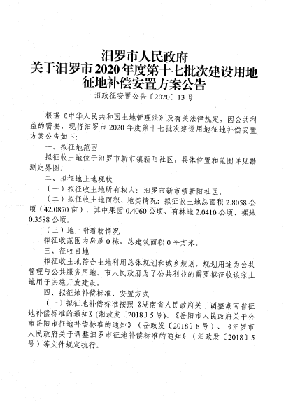汨罗市2020年度第十七批次建设用地征地信息公开