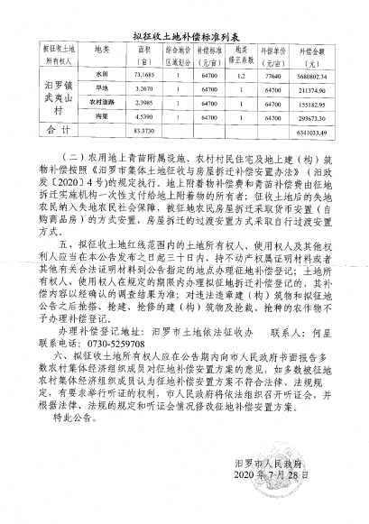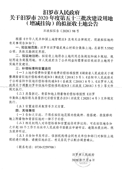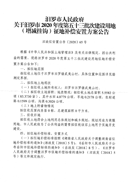 汨罗市2020年度第五十三批次建设用地征地信息公开