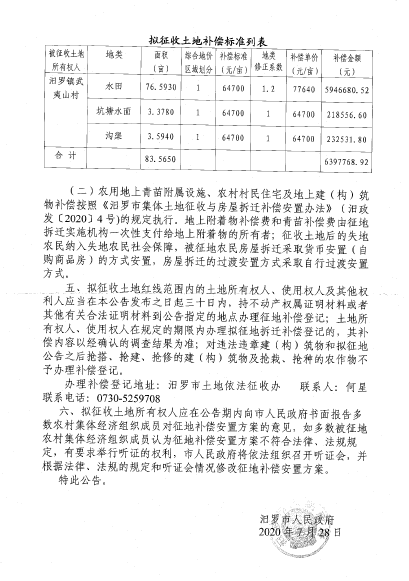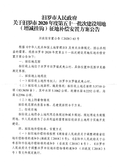 汨罗市2020年度第五十一批次建设用地征地信息公开