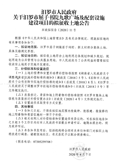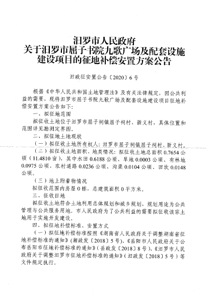 汨罗市屈子书院九歌广场及配套设施建设项目征地信息公开
