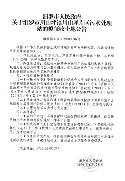 汨罗市川山坪镇川山坪片区污水处理站拟征地公告