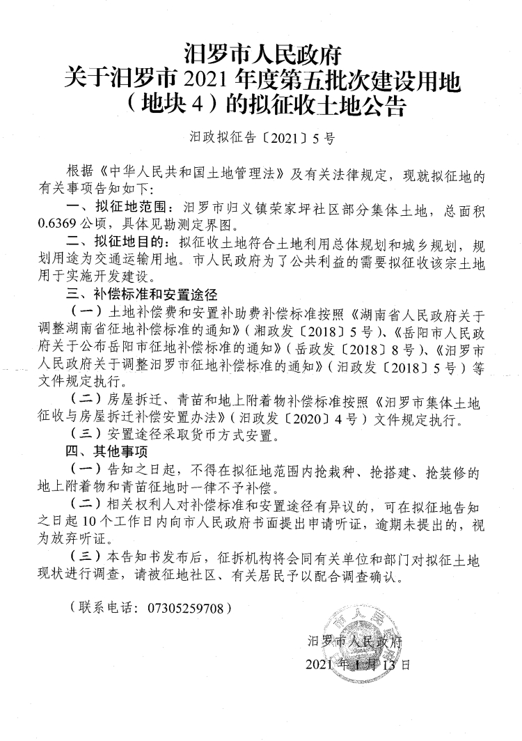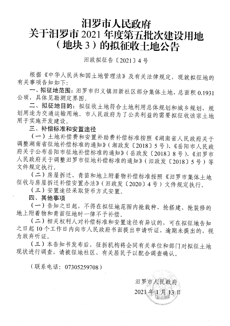 汨罗市2021年度第五批次建设用地(地块1-4)拟征收土地公告