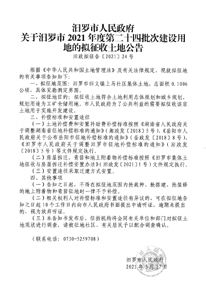 汨罗市2021年度第二十四批次建设用地拟征地公告