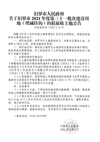 汨罗市2021年度第三十一批次建设用地拟征地公告