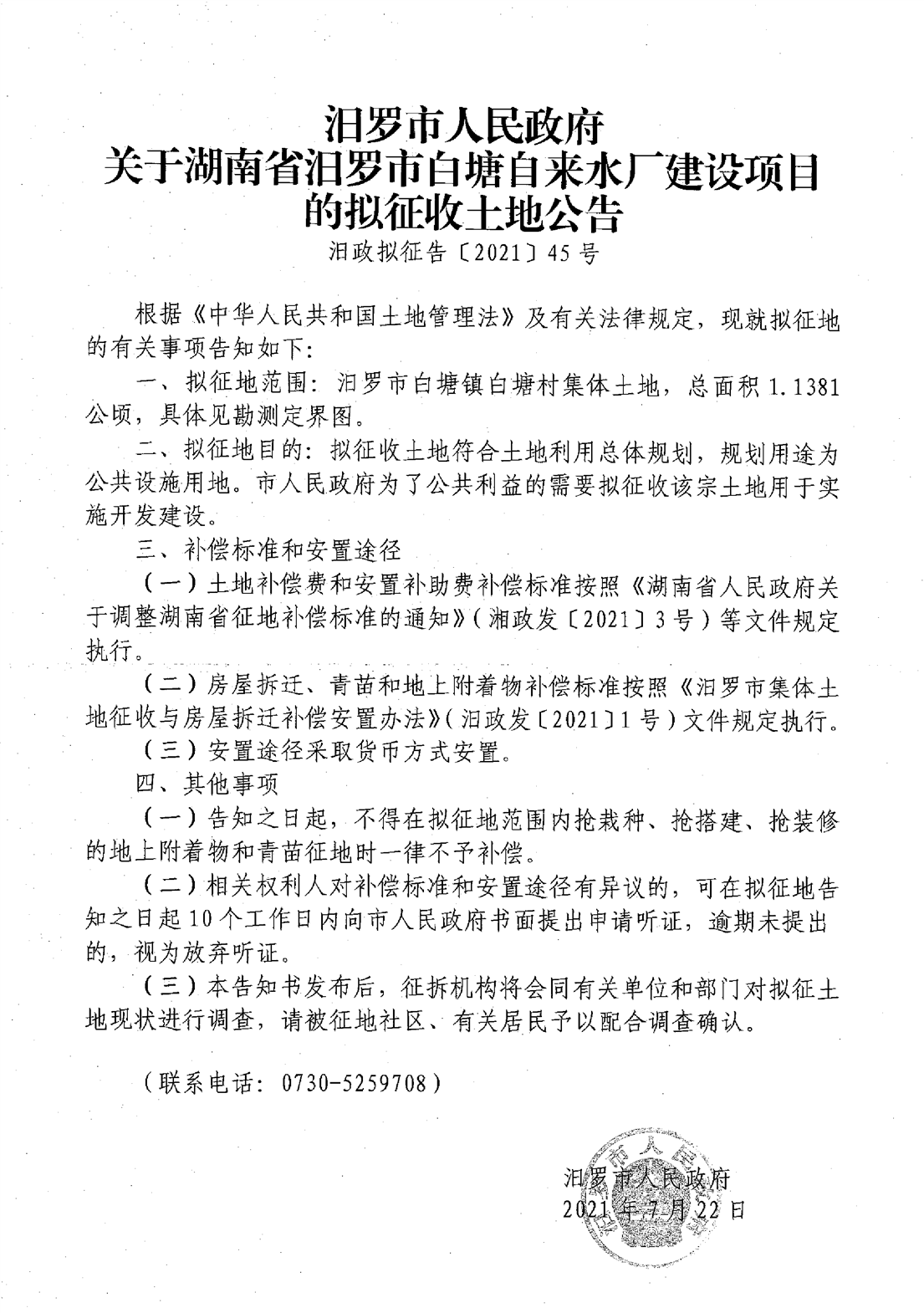 关于湖南省汨罗市白塘自来水厂建设项目的拟征收土地公告