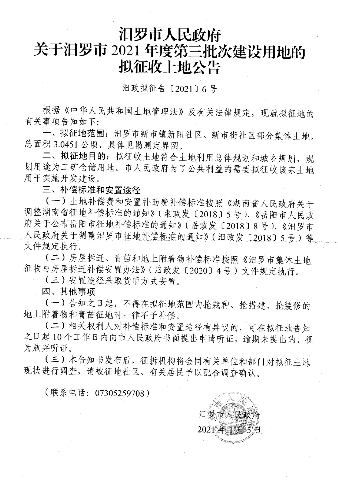 关于汨罗市2021年度第三批次建设项目的拟征收土地公告