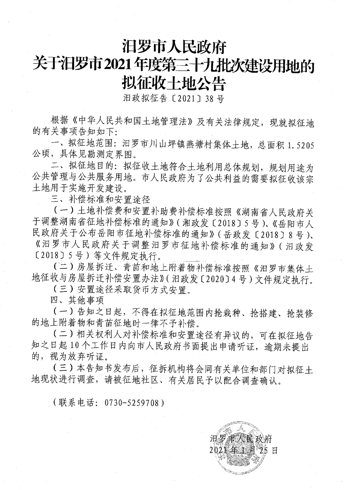 关于汨罗市2021年度第三十九批次建设项目的拟征收土地公告