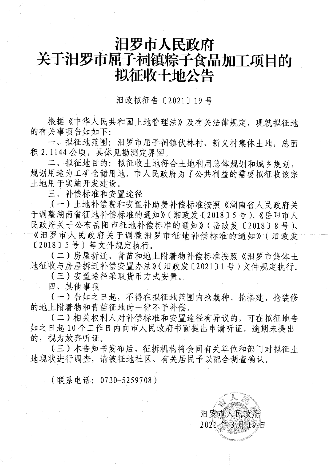 关于汨罗市屈子祠镇粽子食品加工项目的拟征收土地公告
