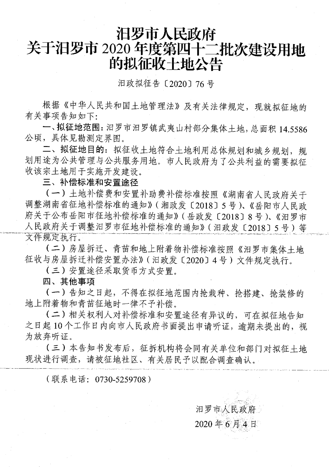 关于汨罗市2021年度第四十二批次建设项目的拟征收土地公告