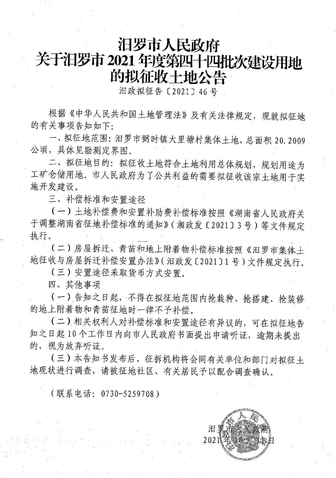 关于汨罗市2021年度第四十四批次建设用地拟征收土地公告