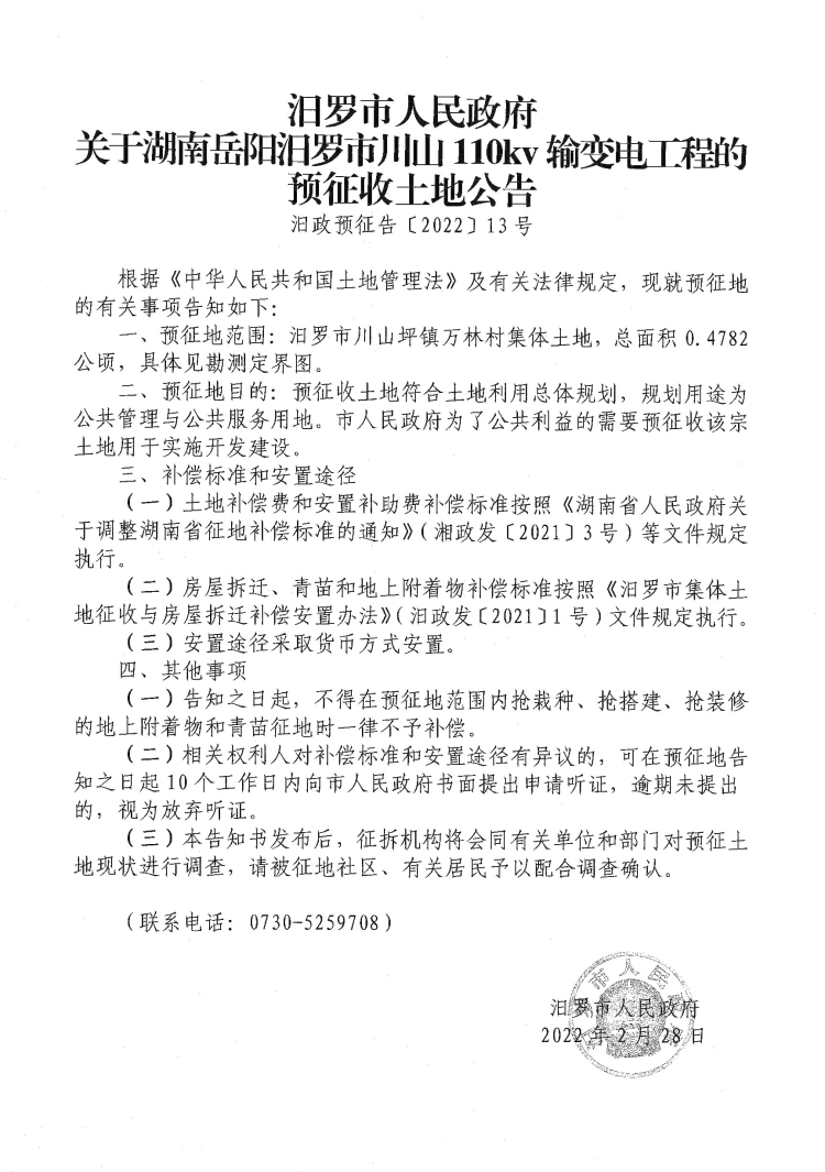 湖南岳阳汨罗市川山110kv输变电工程 预征地公告