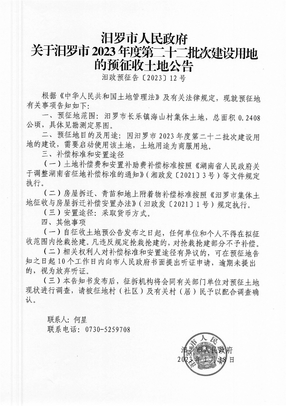 关于汨罗市2023年度第二十二批次建设用地的预征收土地公告