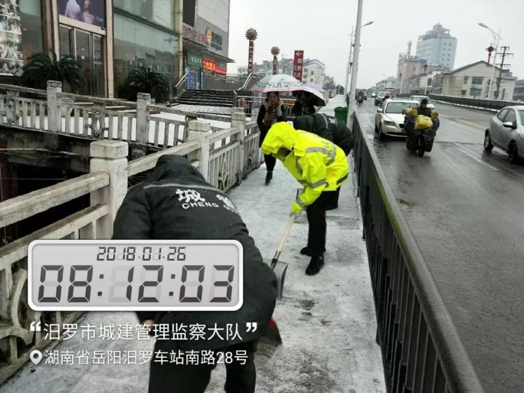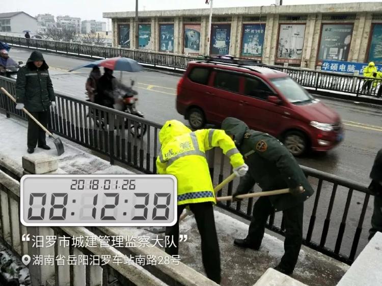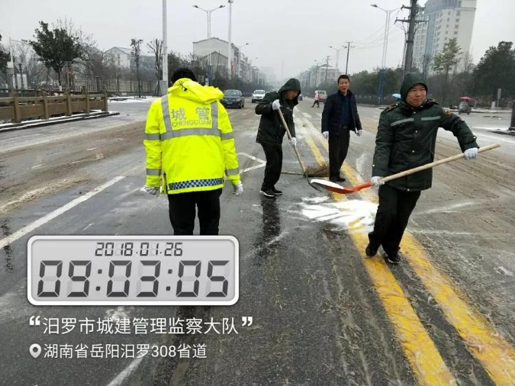 2018年1月26日大雪来临,汨罗城管立即启动冰雪灾害天气应急预案,要求各组、各路段人员按照职责做好对道路安全、居民生活的保障,做好铲雪除冰、应急物资、车辆等准备工作。